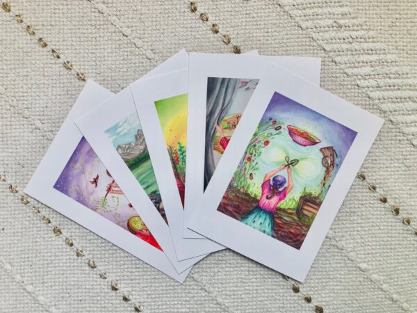 Ti manderemo 5 stampe scelte casualmente (scorri per vedere quali immagini possono capitarti – NB non abbiamo ancora aggiunto le illustrazioni tratte dal mazzo il viaggio della maternità!)